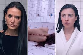 In addition to what I felt was a disappointing ending, I also felt that the scene in which Elisabeth is wreaking havoc in her kitchen–cooking up dishes in a frenzy while watching her young “Sue” self on television and keeping a snide running commentary all the while–should also have been left on the cutting-room floor. It wasn’t as funny as Fargeat thinks it is, it was wholly unnecessary, it detracted from the overall tone of the film, and let’s face it, Demi Moore simply doesn’t have comedic chops.