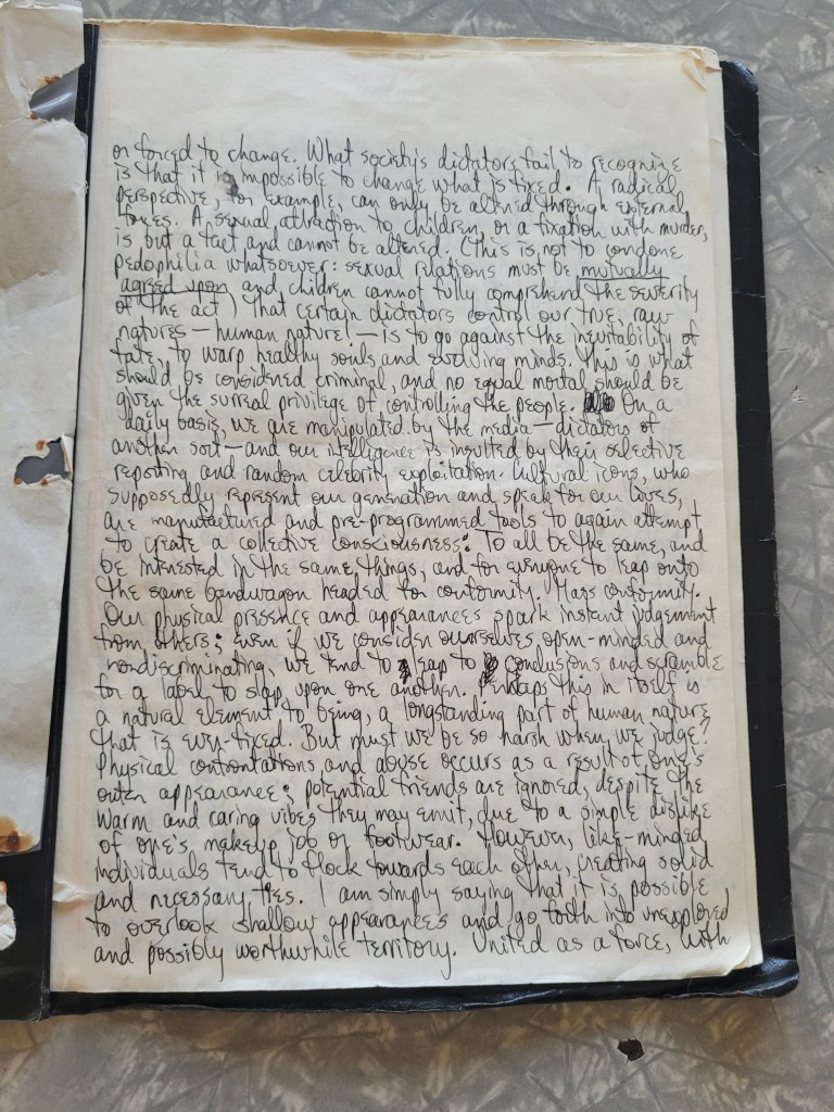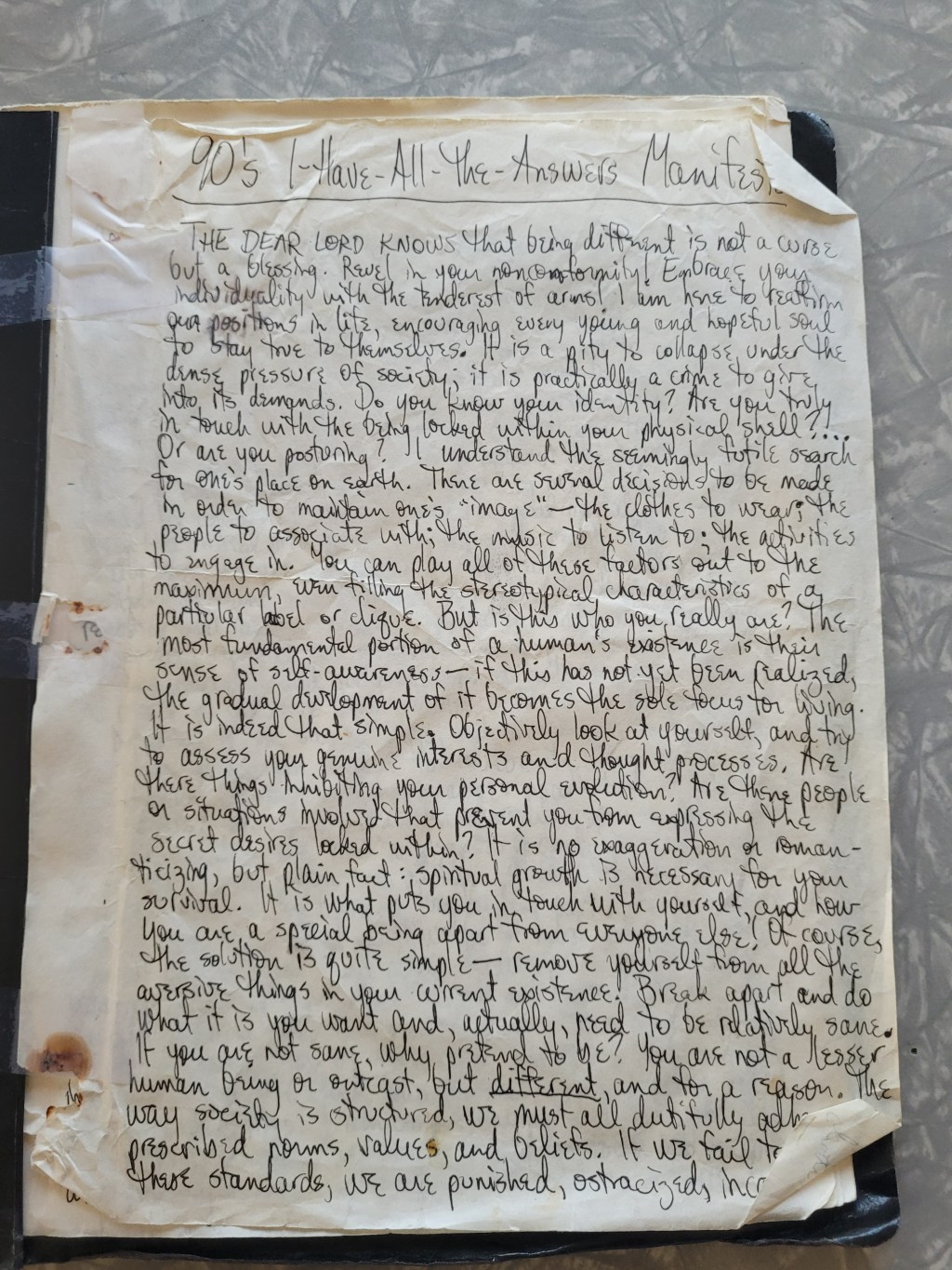At first glance, a few things about this manifesto immediately leap out. First of all, my handwriting is quite sloppy, and I used to write my Es like backwards 3s for some reason. Most significantly, though, there are zero paragraph breaks, and there is a reason for this visual annoyance: you see, the entirety of this vintage three-and-a-half page document was written while buried in a deep armchair in the spring of 1996, soaring at Sputnik heights thanks to being quite finely-tuned on strong amphetamines. In fact, it was supposedly clean crystal meth, something that was and still is completely foreign to me, but the opportunity to sample the goods presented itself to me one fine day at my pal’s apartment, and I was young and indestructible enough to partake. It was one of those rare, fleeting bites of dewy innocence and burgeoning womanhood when you could have Pepsi and a chocolate muffin for breakfast, smoke a pack of smuggled Marlboro reds throughout the day, show up for your minimum-wage shift as a phone-sex operator, finish your Poli Sci 201 homework, do this on repeat, and still somehow look better and better as the days zipped past.